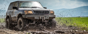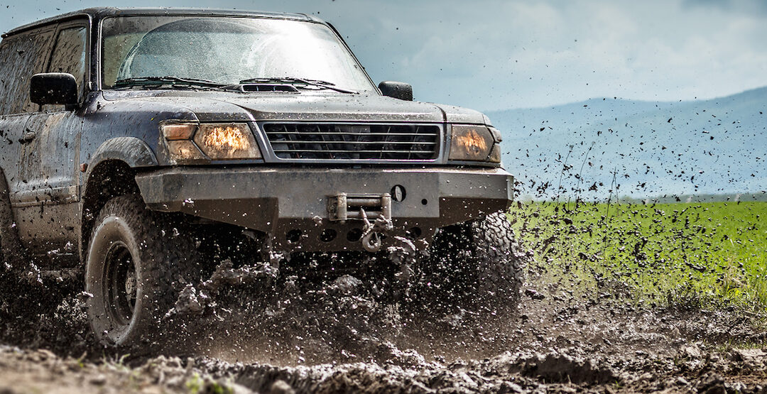 Off road vehicle splashed mud, outdoor shot